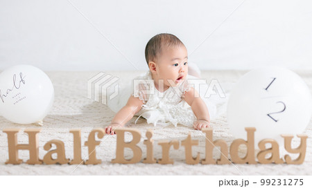 ハーフバースデー ベビードレスを着た生後6ヶ月の赤ちゃん