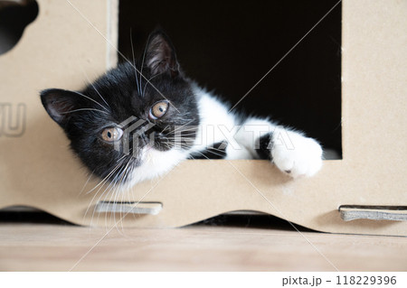 キャットハウスに入ったエキゾチックショートヘアーの子猫