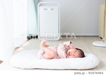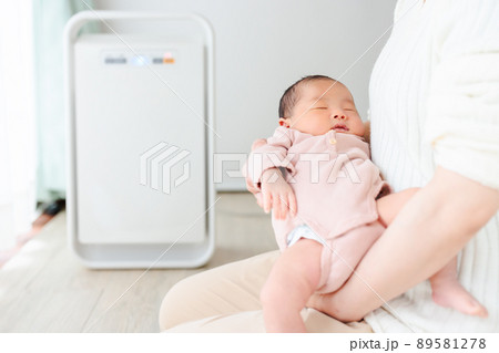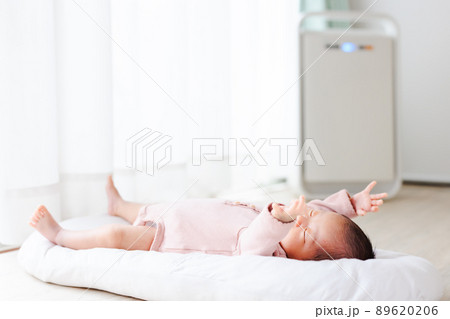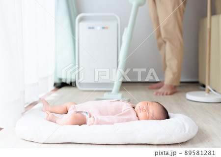 昼寝する赤ちゃんの近くで掃除機をかける 空気清浄機