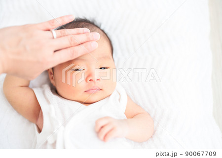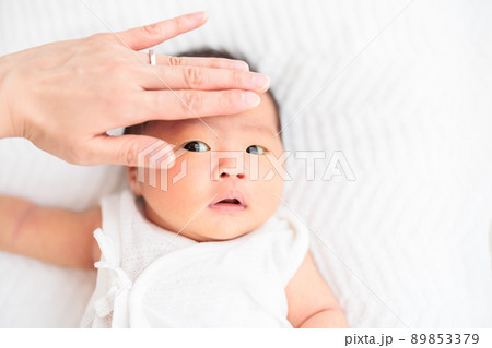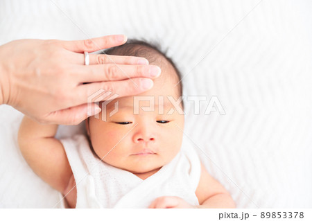 赤ちゃんのおでこに手を当てる 発熱やうつ熱 体温 確認