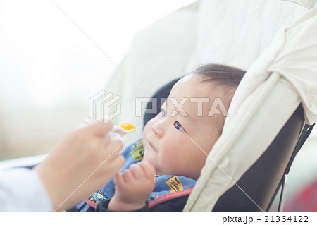 窓辺でベビーチェアに座って離乳食を食べる赤ちゃん