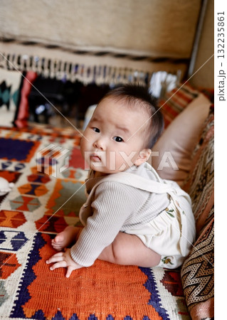 カメラ目線でお座りするかわいい生後8ヶ月の赤ちゃん。