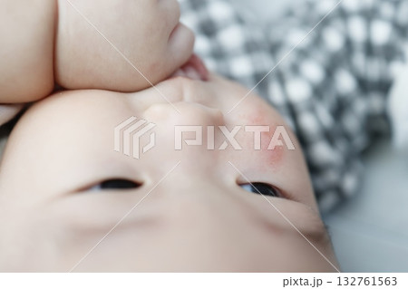 ほほに引っかき傷のある生後8ヶ月の女の子の赤ちゃん。