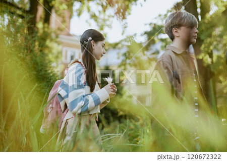 Side view medium shot of teen boy and girl walking along path in local botanical garden