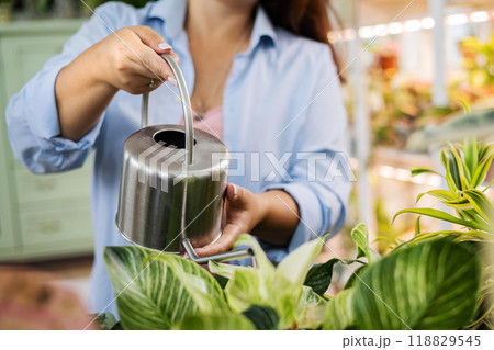 Unrecognizable woman gardener florist growing care use watering can at home indoor garden closeup