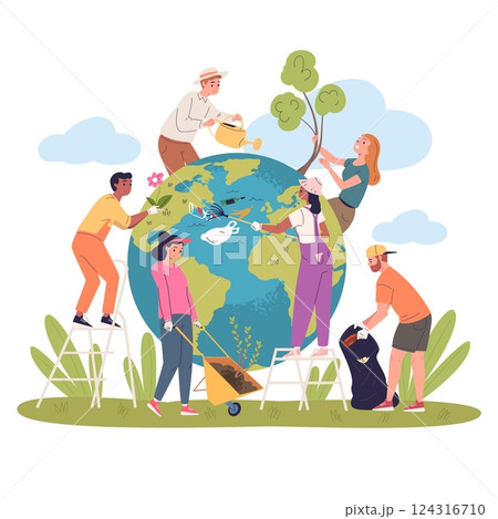 People cleaning earth planet. Eco activists clean world from plastic waste, earth day concept man woman collect garbage and plant trees save environment, classy vector illustration