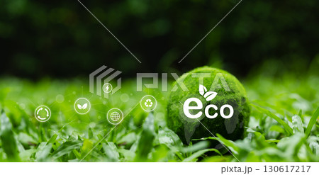 Green eco globe with sustainability icons on grass field, symbolizing renewable energy, recycling, environmental conservation, and eco-friendly lifestyle for future generations.