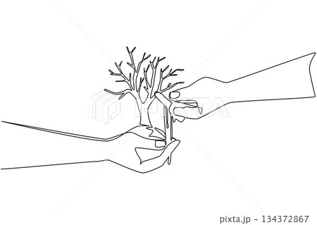 Single line draw of hands nurturing and protecting tree symbolizes conservation concept in World Environment Day, promoting restoration, care, and global awareness of protecting forests and ecosystem