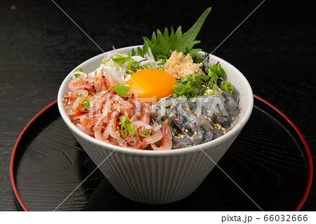 生桜えびと釜揚げしらすの二色丼 生卵のせ
