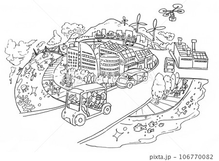 脱炭素社会に向けた環境にやさしいまちづくりの手書きイラスト(都市近郊・線画)