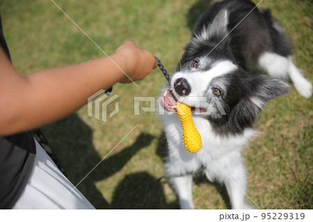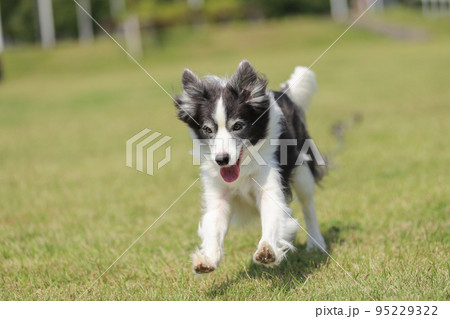 芝生の上で楽しそうに遊ぶ元気なボーダーコリー