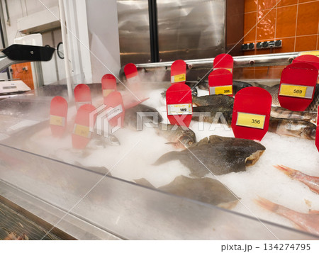 Fresh whole fish and fillets on crushed ice in a supermarket refrigerated display case various types with red price tags indicating sale prices for customers and retailers Fish on display in a store.