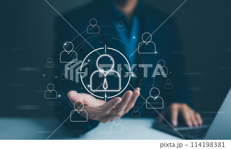 HR, Human Resources Targeting Concept in Business. Businessman use a virtual interface to target a human resource symbol, symbolizing recruitment and team management. Employment headhunting, HRM CRM,