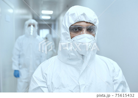 Scientist in PPE suite doing some research and looking through a microscope in laboratory