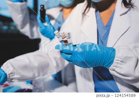 cropped, a professional Asian scientist team is concentrating on their medical experiment
