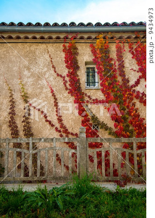 A window on an old stone house overgrown with decorative grapes. Red leaves Virginia creeper in autumn