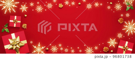 赤い背景に置かれたクリスマスプレゼントと雪の結晶の装飾 / コピースペースのあるクリスマス用背景