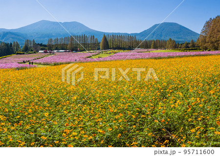 霧島連山とメタセコイア並木を背に満開のコスモス畑