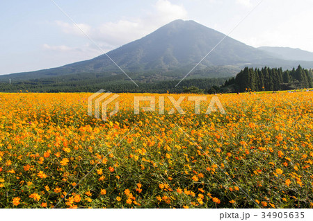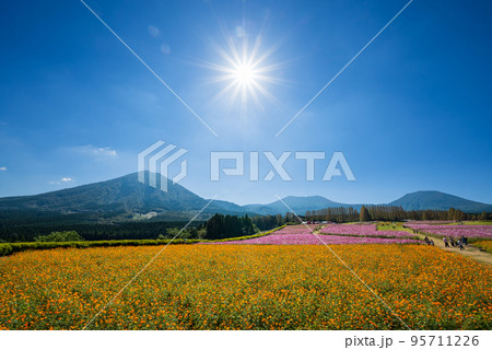 霧島連山を背に太陽の日を浴びて満開のコスモス畑