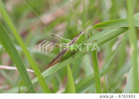 生き物 昆虫 セスジツユムシ、背中の条が目立つ。こちらはメスで条の幅がオスより細い