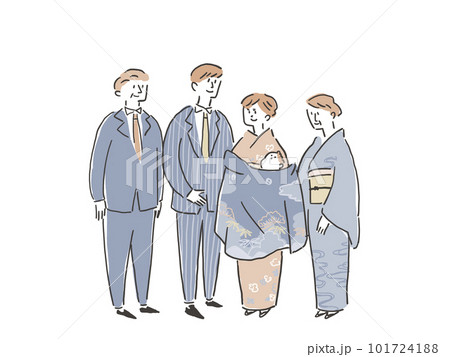 お宮参り、家族、母が赤ちゃんを抱っこしている(赤ちゃん;男の子)、背景カラー