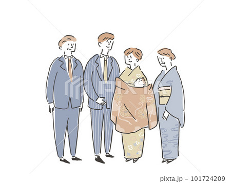 お宮参り、家族、母が赤ちゃんを抱っこしている(赤ちゃん;男の子)背景白