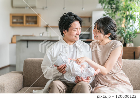 赤ちゃんを抱く夫婦・ママとパパ・新生児(子育て・育児)