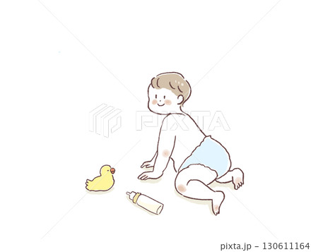 はいはいする赤ちゃん、おもちゃ、アヒル、哺乳瓶、線画