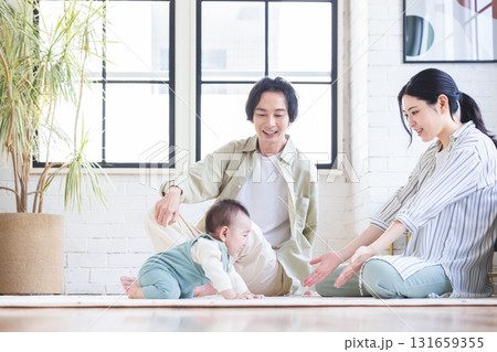 赤ちゃんと若い日本人夫婦・幸せな結婚生活・新婚(産褥期)
