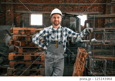Showing and holding little shovel and brick. Handsome Indian man is on the construction site
