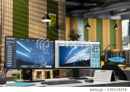 Empty alternative energy tech company with design program on computer display used for monitoring eco power line towers. CAD software on PC monitor used to upgrade transmission tower systems