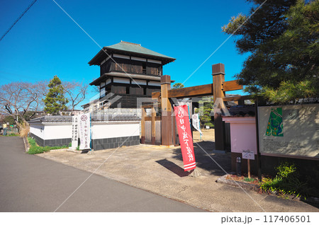 田中城下屋敷に移築された田中城本丸櫓と再現された冠木門(静岡県藤枝市)