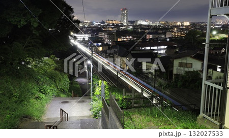 田奈第三公園横の階段から見た東急田園都市線を走る電車の光跡と夜景