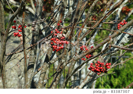 葉が落ちて赤い実が目立つナナカマド 福島県只見町