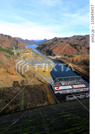 秋の日差しを浴びる田子倉ダムと輝く田子倉湖 福島県只見町