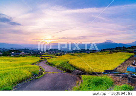 【秋素材】収穫時期を迎えた中野の棚田の日の出【山梨県】