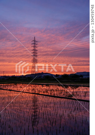 「埼玉県」見沼田んぼ 田植えの時期、水田に映るさいたま新都心