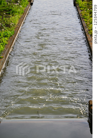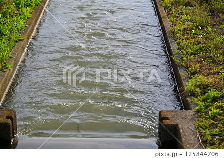 水量たっぷりの田圃の用水路 早々の田植え用 さいたま市