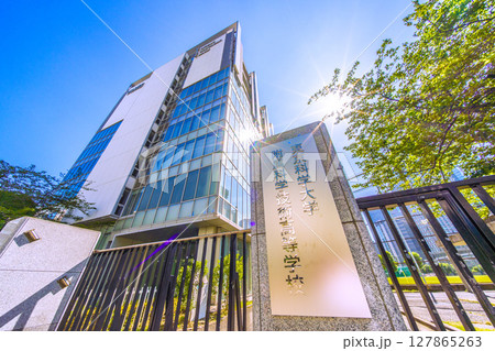 日本の東京都市景観 真夏のような日差し…田町駅前の東京理科大学附属科学技術高等学校などを望む
