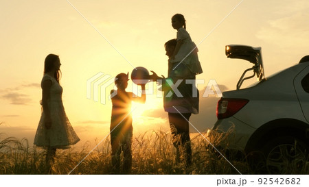 children with father mother play ball near car sunset. happy family silhouette. chidhood dream. group people picnic park. peaceful joyful man with boy son girl daughter woman wife. teamwork traveling.