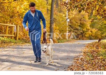 A man walks with Labrador retriever dog