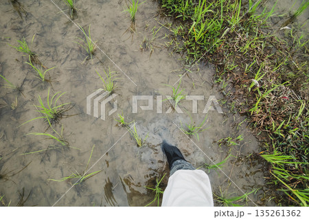 田植え後、田んぼの中を歩く