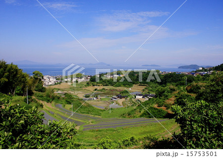 蜜柑畑から見下ろす棚田と瀬戸内海