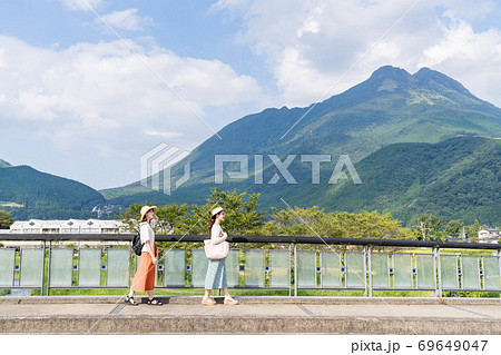 女子旅で湯布院を散策する若い女性と友達 【9月】