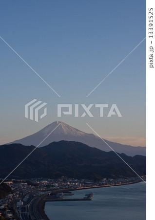 薩埵峠付近の東名高速道路と富士山、由比漁港(静岡県)