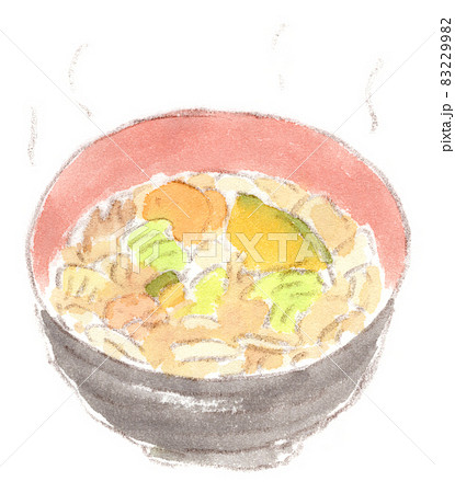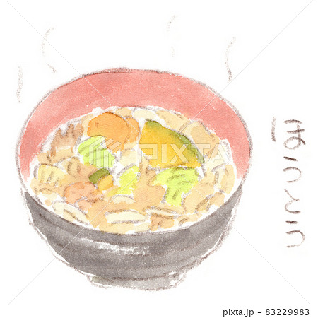 秋・冬はお鍋で温まろう:お椀によそってあるほうとう(鍋物、めん類、うどん)の水彩イラスト