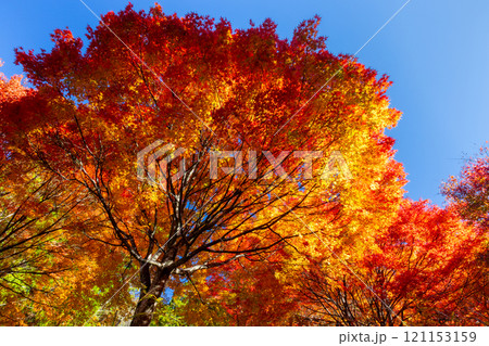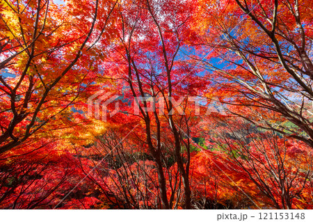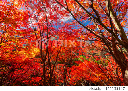 埼玉県秩父市大滝 栃本地域の秩父往還沿いの真っ赤に紅葉したモミジ群生 鮮やかな逆光の景色