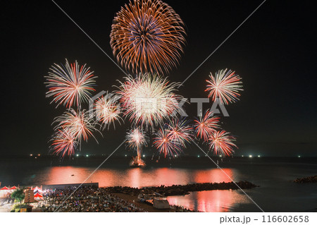 〔福井県南条郡・7月〕河野夏まつり 山々に木霊するダイナミック花火 甲楽城海水浴場正面からの眺め