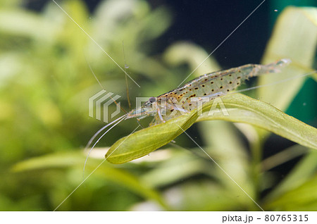 水面に浮かぶ水草と苔を食べるミナミヌマエビ