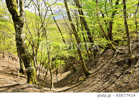 丹沢の甲相国境尾根 モロクボ沢ノ頭 新緑の森と大室山